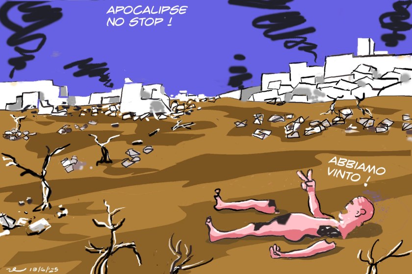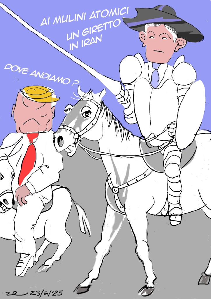 E il Nobel per la pace a Troglo-Trumpone? È proposto da Netaniolo per riconoscenza, dato il continuo appoggio incondizionato; soprattutto per le bombe sull’Iran. Dietro il paravento verbale ostentato: tregua-pace-pace-tregua in 48 ore, su ogni fronte di guerra ci sono armi americane. Un ricco bottino che, rovesciando ogni logica, vale un Nobel per la pace. Se la Svezia rigetta deve aspettarsi dazi decuplicati.