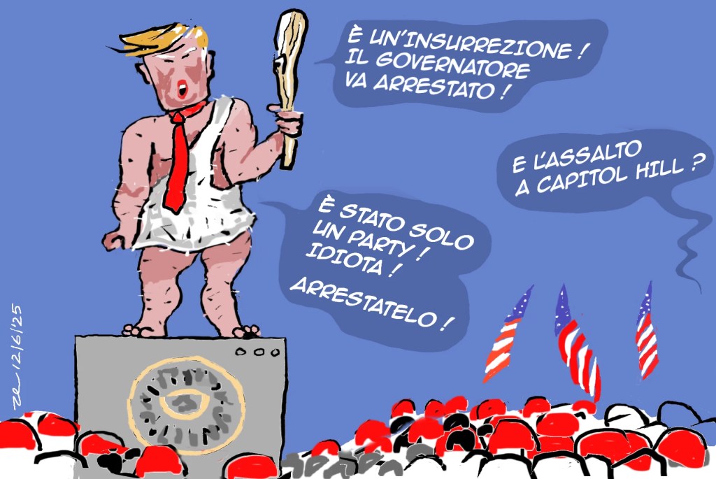 Troglo manda la guardia nazionale e i marines a Los Angeles e a San Francisco per sedare le rivolte contro le maxi retateICE(Agenzia di sicurezza per il controllo immigrati) da lui fomentate. No ICE, here!gridano le folle. Mira alle gambe e ad altezza congrua con proiettili di gomma. Ordina coprifuoco. Ordina via social di arrestare tutti quelli con casco e a volto coperto (per ora). Ordina rastrellamenti, a mucchi, per attuare le deportazioni promesse. Prima meta Guantanamo, tristemente famosa, dove vuole rinchiudere fino a 9000 immigrati “irregolari“, anche se solo presunti. Nessuna comunicazione alle nazioni da cui provengono i malcapitati. Il governatore Gavin Newson della California si oppone e si rivolge a un giudice. Troglo cerca di battere sul tempo.